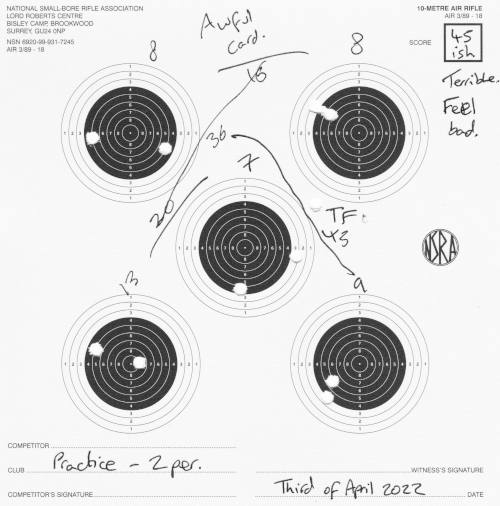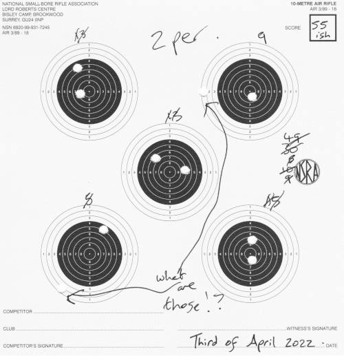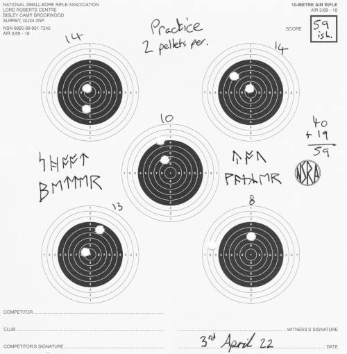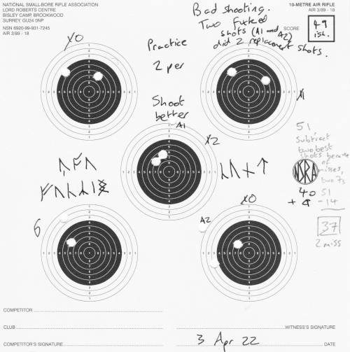 | AR Unsupported | Practice 1 | 10m AR | 37 | I wrote a lot on this card. In runes, "you fucking cunt". Bad shooting, two fucked shots, did 2 replacement shots. In rescoring I wrote: 51, subtract two best shots because of misses, two 7s, 51-14 = 37, 2 misses. | SCAN |