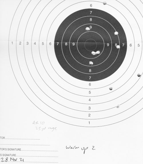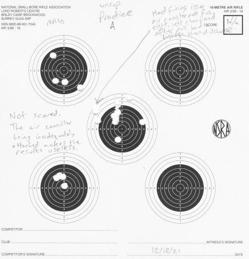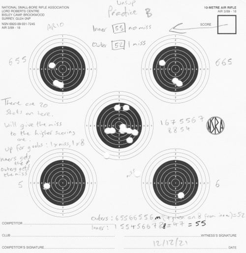 | " | Practice B Inner | " | ~55 | This one was scored from the inner target, and it got the spare 8 as it had the lower score of the two. | " |