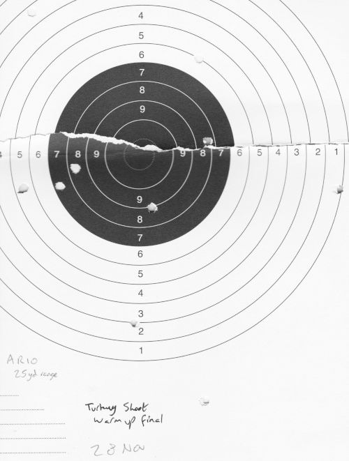 Basically, every November to December time, the club has an informal event where everyone shoots a specific type of target, which is then handed in. At the end of the event period, the runner lays each target over a specific picture of a turkey, and whoever got a shot closest to the turkey's eye wins a small prize.