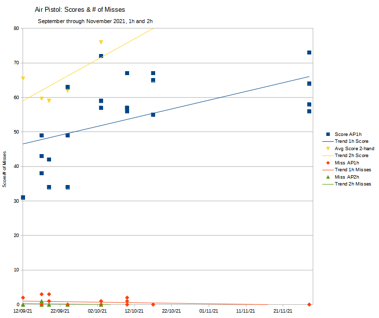 Here's a chart logging my average scores and number of misses, with lines of best fit. I've combined it with my data from September and October.
