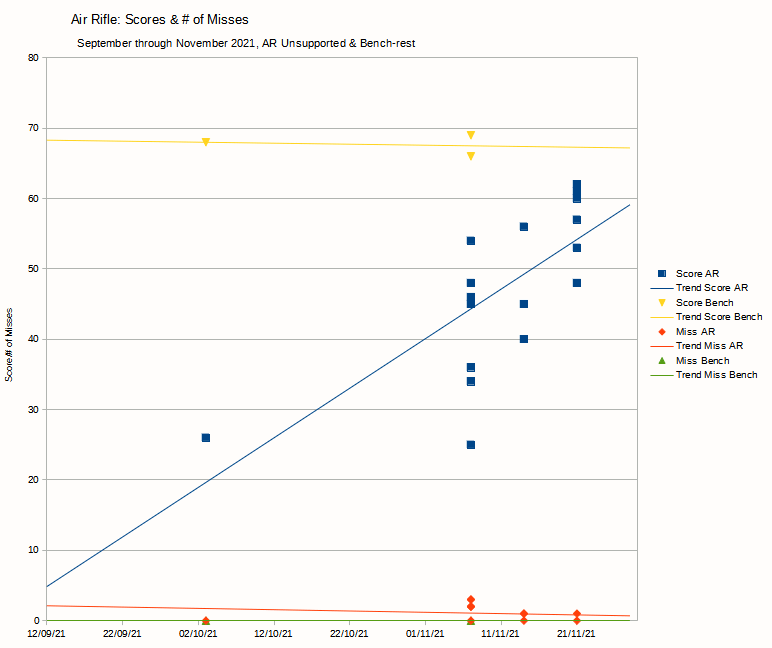 I don't have enough data to start seeing a trend with air rifle; the few instances of bench-rest show that my level of skill is steady, and it appears I'm on an upward trajectory with unsupported air rifle, but I need more data.