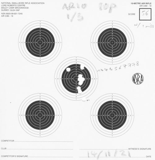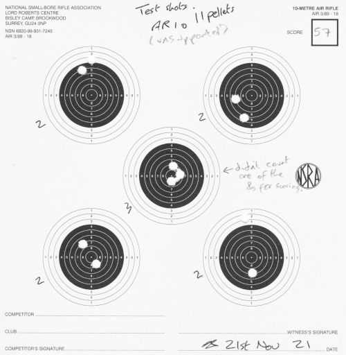 | " | Test shots AR10 | 57 | I did 11 shots on this card, which was all I had left in my tin. In scoring the card, to make it 10 shots again I removed an 8, one of the highest shots on the card. (I did this card after the bench-rest ones below) | SCAN |