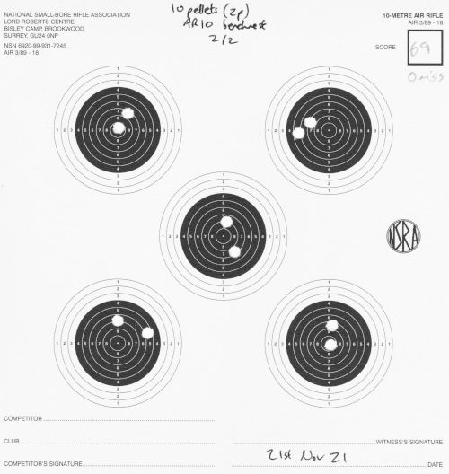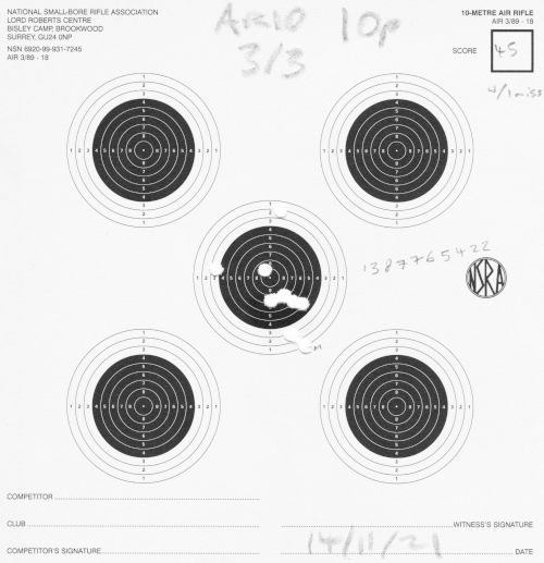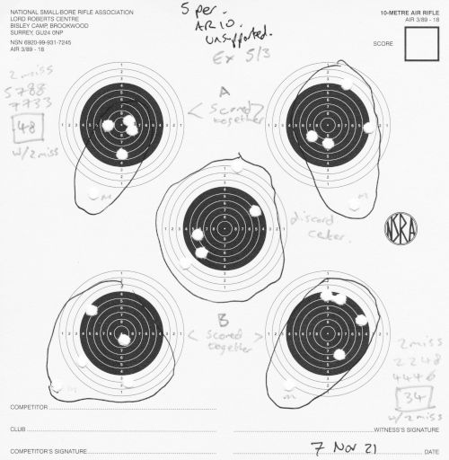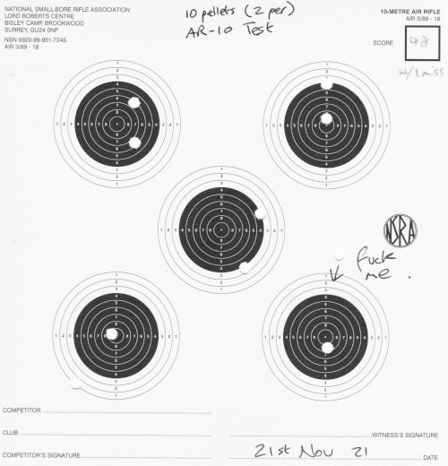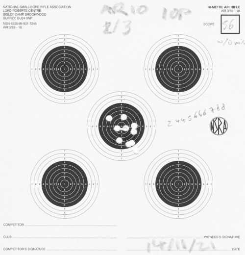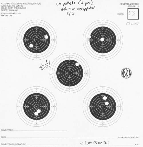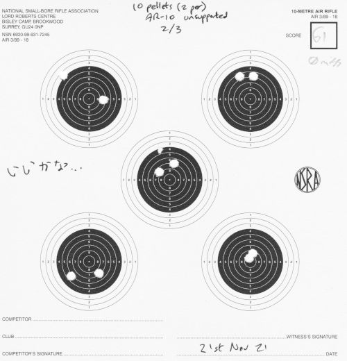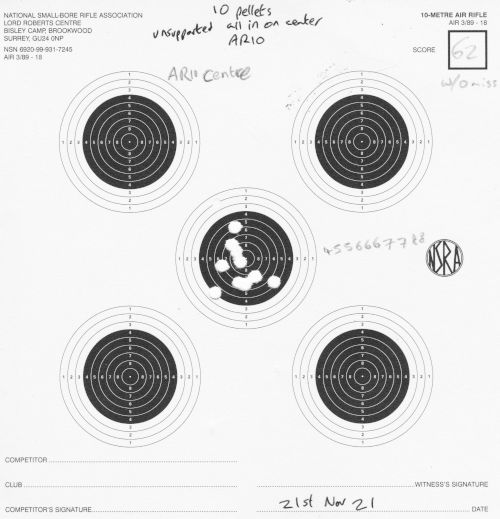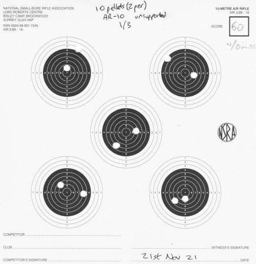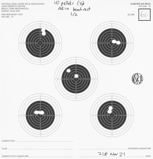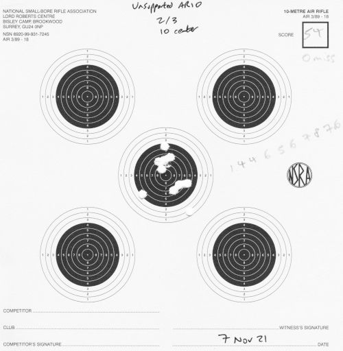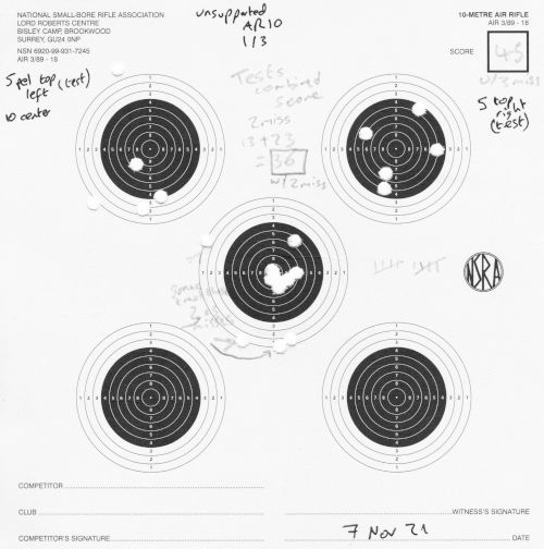 Still AR10, still 10m. I finally switched to (mostly) 2 shots per each of the 5 targets per card. I mostly shot unsupported, but did a little bit of bench-rest too.
