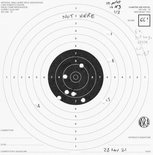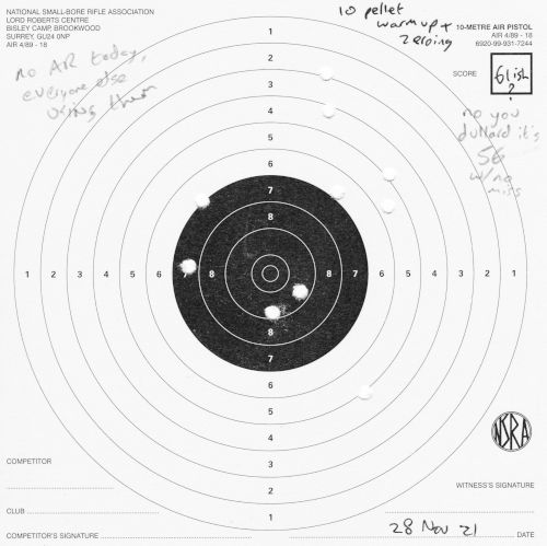 I was still shooting in much the same way this week as I was on the 7th; shooting all at the centre target. Also, apparently I had no pen or pencil this day and resorted to crayon for card markings.