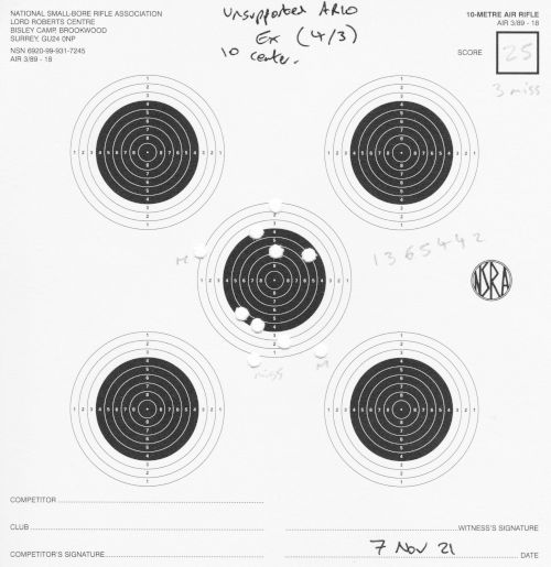 It is a little difficult to score much of today's cards. Why? Because I fired most shots at the centre target of the card, instead of 2 per each of the 5 targets on the card. Why was I doing that? Because of the utterly awful unsupported score I got last month. I wanted to limit variables, improve my stance without having to worry about irrelevancies.