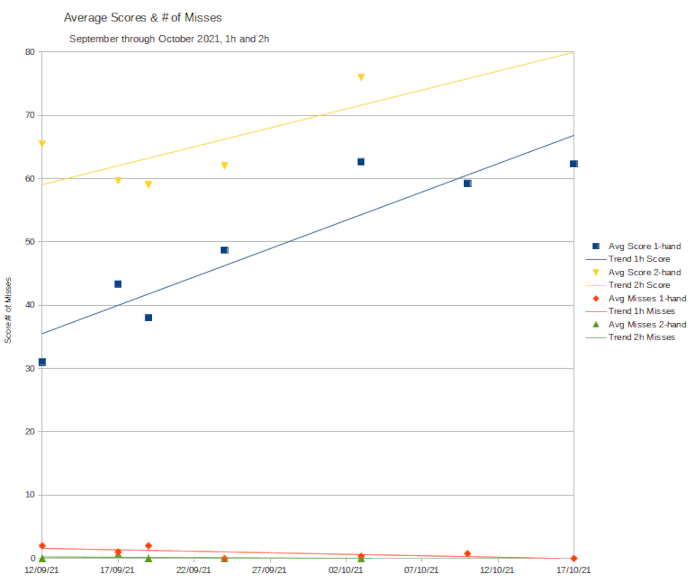 Here's a chart logging my average scores and number of misses, with lines of best fit. I've combined it with my data from September, since I don't really have that many data points to go off (especially for 2 hand, since I only did one card 2 hand this month). I also haven't charted the AR data points, since I haven't shot enough with the AR to be worth it. Instead, those few crumbs of data will be brought into the charts whenever I start shooting AR more.