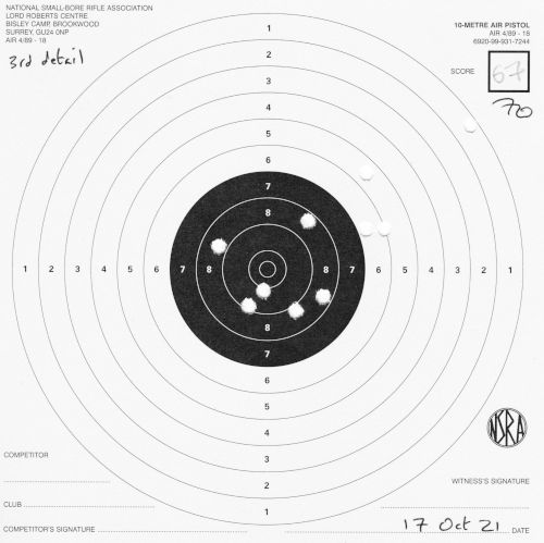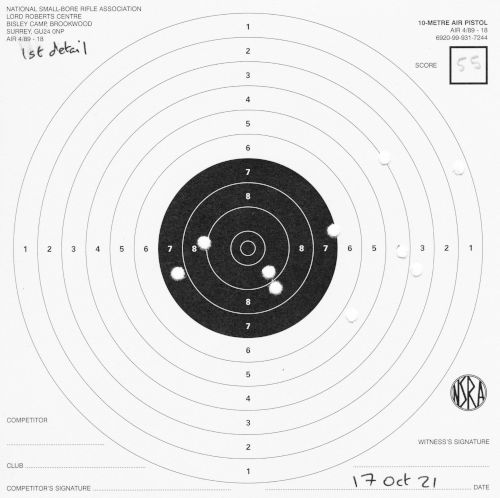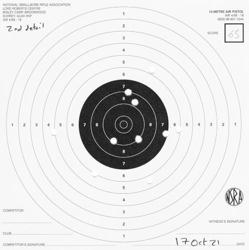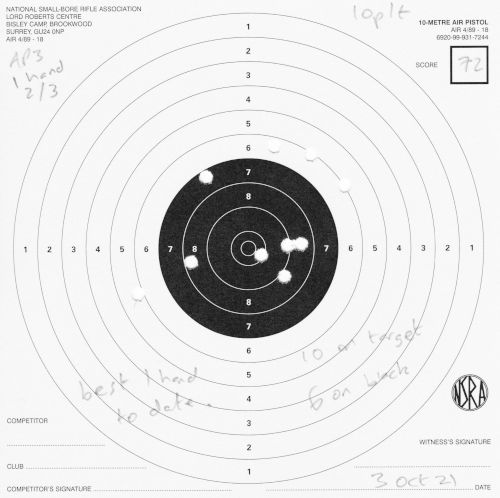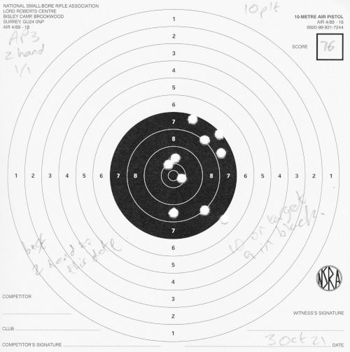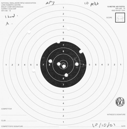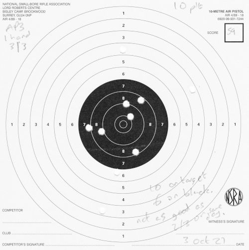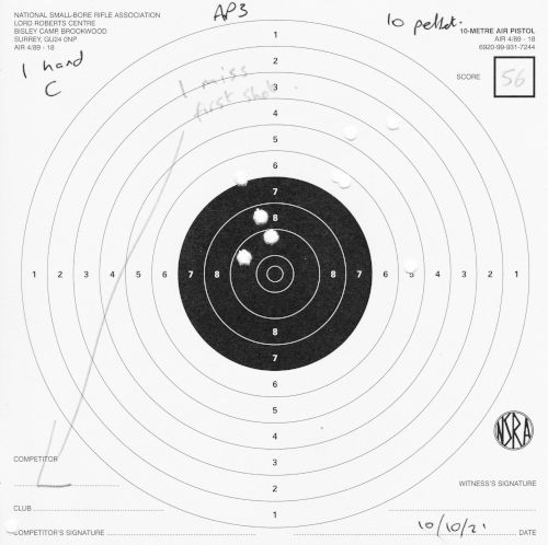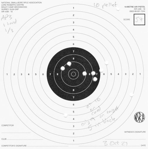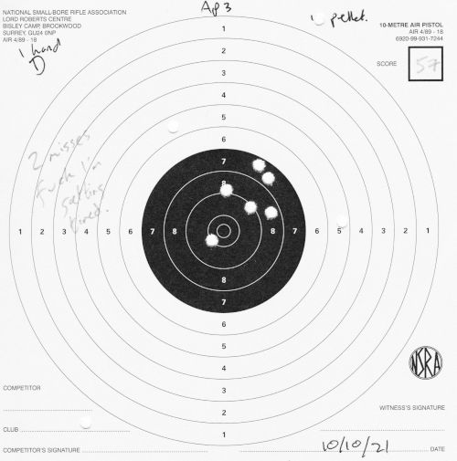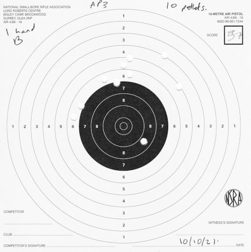 | Air pistol AP3 | 1h | 1 hand 1/3 | 57 | 1 missed shot, "only 9 on target, 5 in black" (centre) | SCAN |