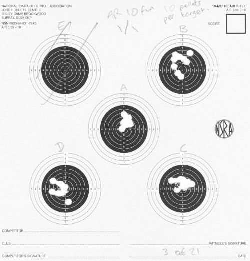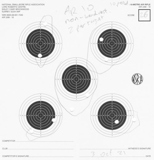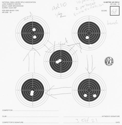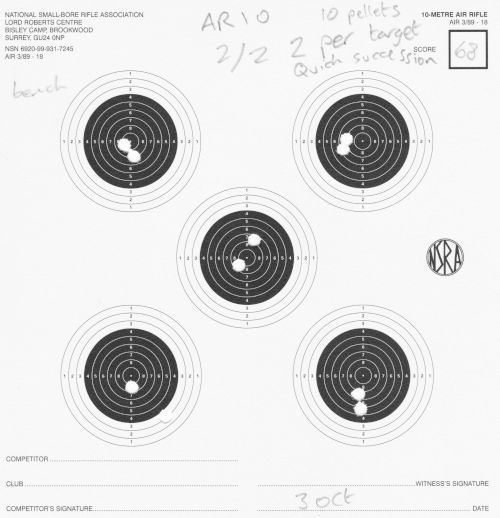 | Air rifle AR10 | Bench-rest | AR10 1/2 | 68 | Fired in quick succession; bench-rest is quite easy, so I was kicking it up a notch in speed, giving myself less time to sight the target. | SCAN |